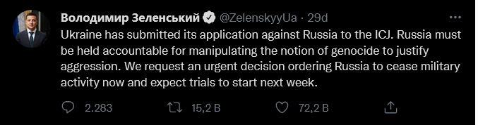 Zelenski, konuyu Uluslararası Adalet Divanı'na taşıyarak Rusya'nın soykırım kavramını manipüle etmekten sorumlu tutulmasını ve mahkemenin Rusya'nın askeri faaliyetlerini durdurmasını emderen "acil" bir karar vermesini istedi. Zelenski'nin paylaşımı şöyle: