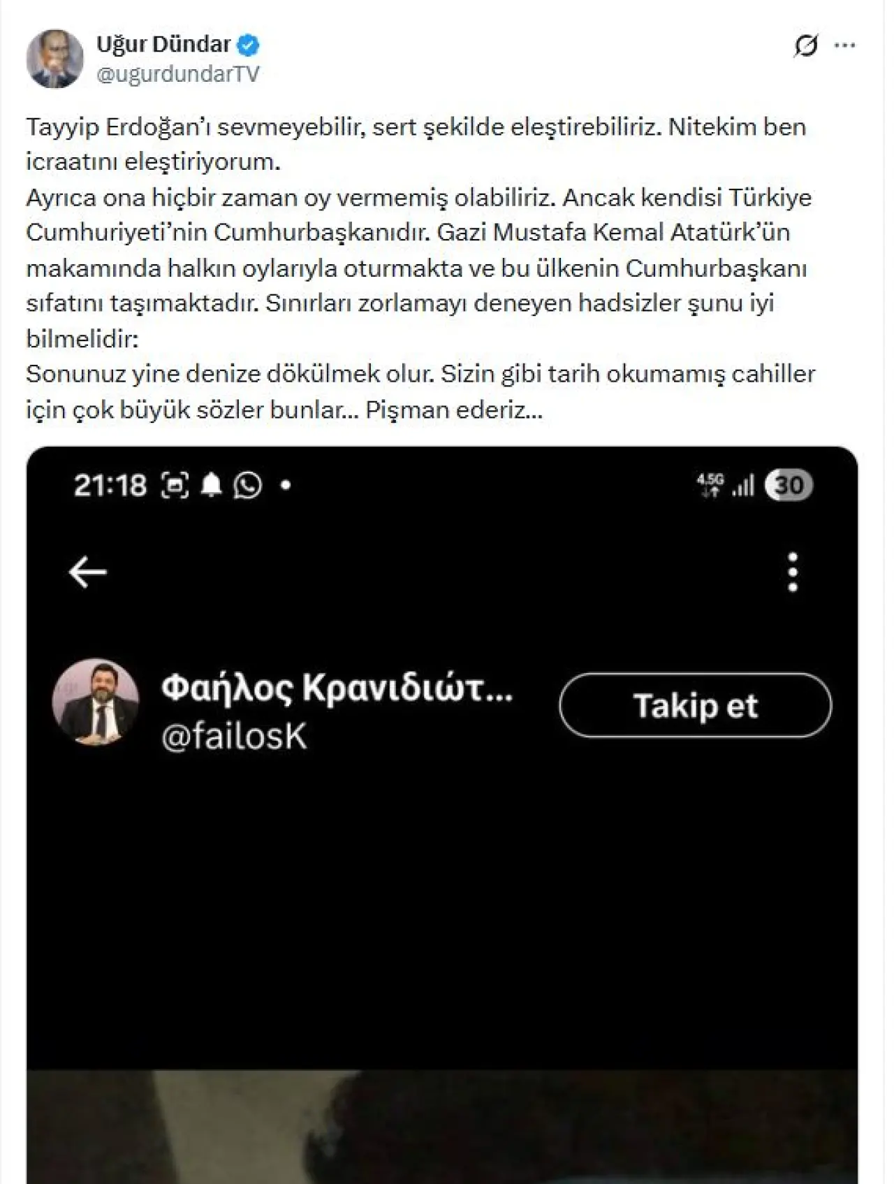 Duayen gazeteci Uğur Dündar, sosyal medya hesabı üzerinden Failos Kranidiotis, adlı Yunanistanlı bir akademisyen Cumhurbaşkanı Recep Tayyip Erdoğan'a yönelik çirkin paylaşımına ateş püskürdü. Kranidiotis'in yapay zeka teknolojisi kullanarak Erdoğan'ı Venezuela Devlet Başkanı Maduro'nun yerine koyup ABD ajanları tarafından kaçırıldığını tasvir etmesi kamuoyunda büyük tepki çekti. Bu küstah paylaşımla ilgili ise en net tepkilerden birisi de Uğur Dündar'dan geldi.