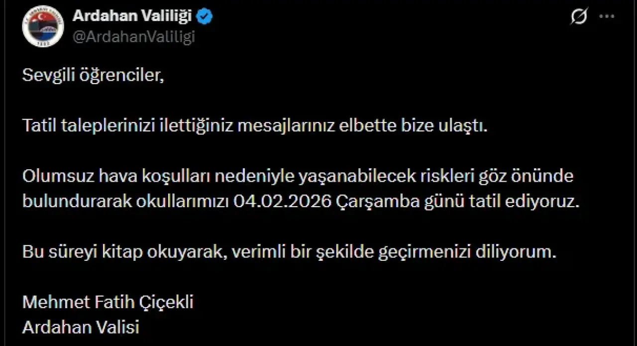 “4 Şubat 2026 Çarşamba günü Posof ilçesi hariç olmak üzere il genelinde Milli Eğitim Bakanlığı’na bağlı tüm resmi ve özel örgün ile yaygın eğitim kurumlarında eğitim ve öğretime bir gün süreyle ara verilmiştir.”