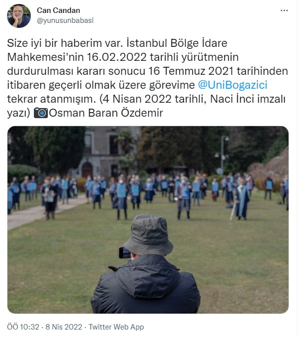 Candan Twitter hesabından yaptığı paylaşımda, "Size iyi bir haberim var. İstanbul Bölge İdare Mahkemesi’nin 16.02.2022 tarihli yürütmenin durdurulması kararı sonucu 16 Temmuz 2021 tarihinden itibaren geçerli olmak üzere görevime tekrar atanmışım" ifadesini kullandı.