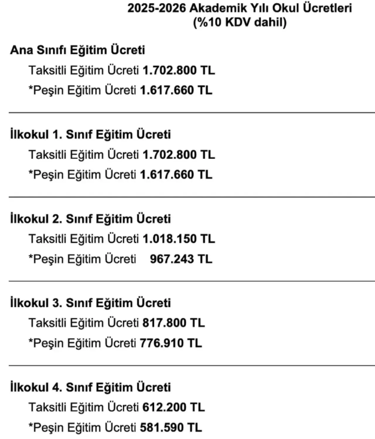 Yayımlanan fiyat listesine göre, Koç Okulu’nda anaokulu ve ilkokul 1. sınıf için kayıt ücreti 1 milyon 702 bin 800 TL olarak belirlendi. Ortaokul düzeyi için ücret 1 milyon 470 bin 600 TL, lise için ise 1 milyon 625 bin 400 TL olarak açıklandı.