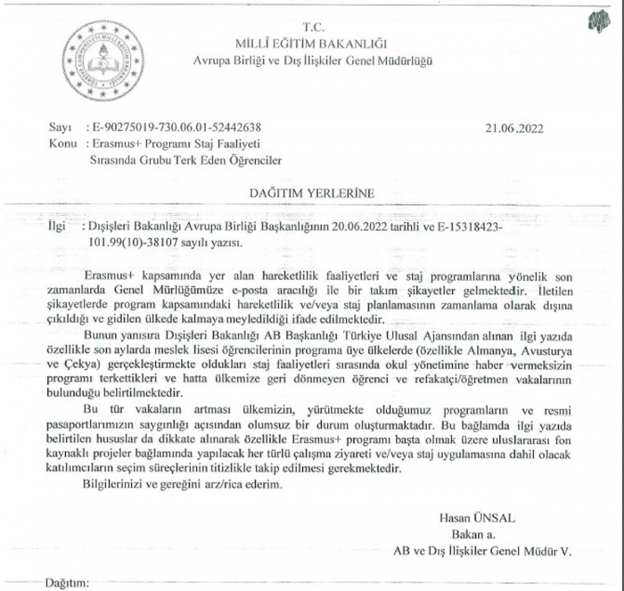Dışişleri Bakanlığı AB Başkanlığı, İçişleri Bakanlığı AB Dış İlişkiler Daire Başkanlığı ve Ulusal Ajans, “Erasmus Programı ve Staj Programları” konulu resmi bir yazıyla, proje gruplarını terk eden öğrenci ve öğretmenlerle ilgili Milli Eğitim Bakanlığı'nı uyardı. MEB Avrupa Birliği ve Dış İlişkiler Genel Müdürü Hasan Ünsal bu uyarılar üzerine, 81 il milli eğitim müdürüne ve bakanlık merkez teşkilatına resmi yazı gönderdi.