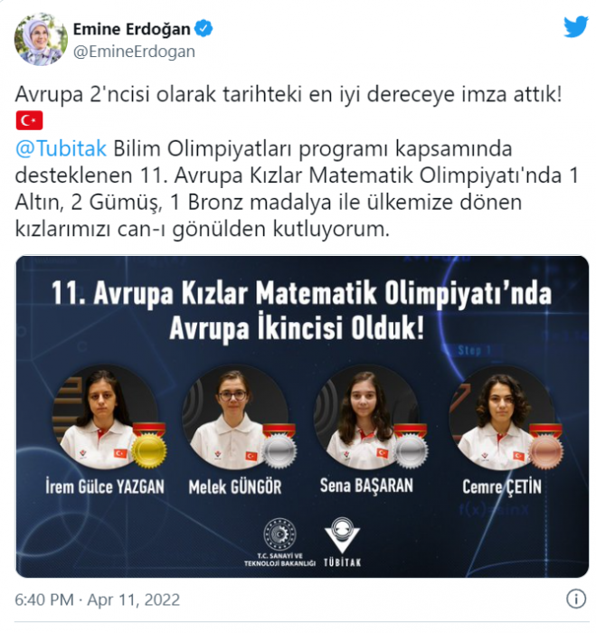 Türkiye'nin Avrupa Kızlar Matematik Olimpiyatı'ndaki başarısını sosyal medyadan duyuran Cumhurbaşkanı Recep Tayyip Erdoğan'ın eşi Emine Erdoğan, dereceye giren öğrencileri tebrik etti.