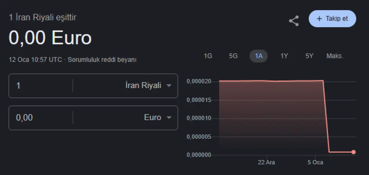 Döviz kurlarına baktığınızda 1 İran riyalinin (IRR) 0 Euro olarak görünmesi, teknik bir "yuvarlama" sonucudur. 12 Ocak 2026 itibarıyla 1 Euro, yaklaşık 1.580.000 (1.5 milyon) İran riyali seviyelerine kadar gerilemiştir. Bu durumda 1 riyalin değeri 0.00000063 Euro gibi çok küçük bir rakama tekabül eder. Çoğu dijital platform ve bankacılık uygulaması, virgülden sonraki bu kadar küçük basamakları gösteremediği için değeri doğrudan "0" olarak yuvarlar.