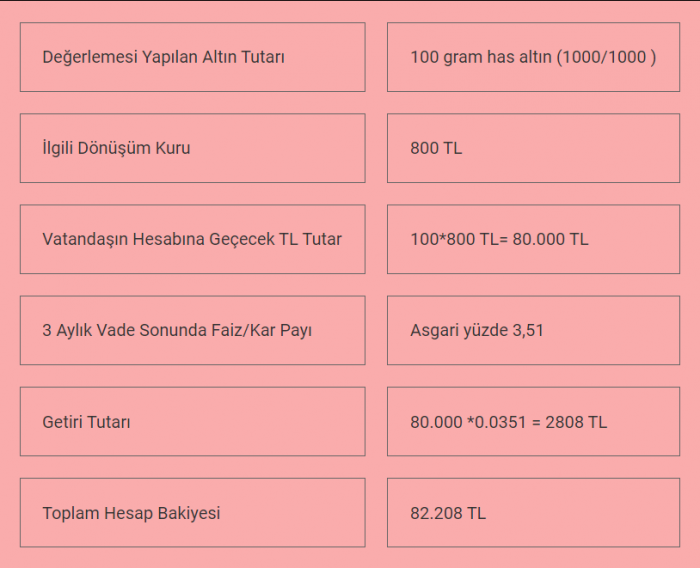 Vatandaşın fiziki altınını rafinerilerin kuyumcu ağları veya bankaya teslim edip altın dönüşümlü TL mevduat ve katılım mevduat hesabı açtırmaları halindeki senaryo örnekleri şöyle: