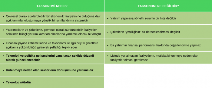 Kısaca, AB Taksonomisini, Avrupa’yı 2050 yılına kadar iklim nötr hale getirmek üzere özel yatırımları ihtiyaç duyulan faaliyetlere yönlendirmeye yönelik bir rehber olarak düşünebiliriz.