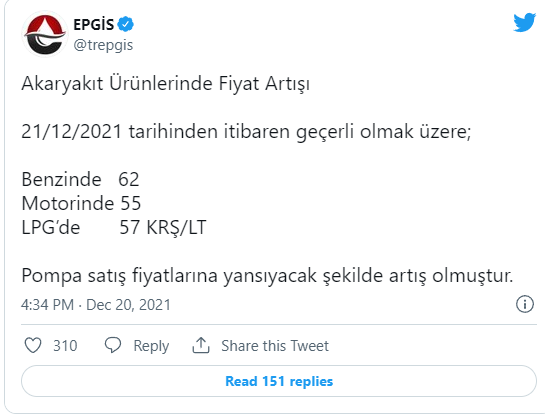 Buna göre benzine 62, motorine 55, LPG’ye 57 kuruş zam geldi.
