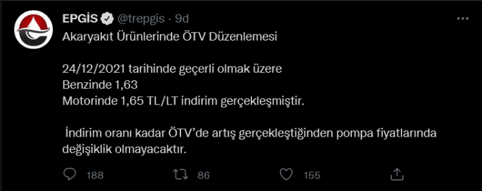 Söz konusu indirim ise pompa fiyatlarına yansıltılmayacak. 22 Aralık tarihinde Cumhurbaşkanı Erdoğan'ın imzaladığı karara göre; akaryakıta indirim gelmesi dahilinde ÖTV'ye yansıtılacak. Söz konusu ÖTV kararının detaylarını okumak için tıklayın.