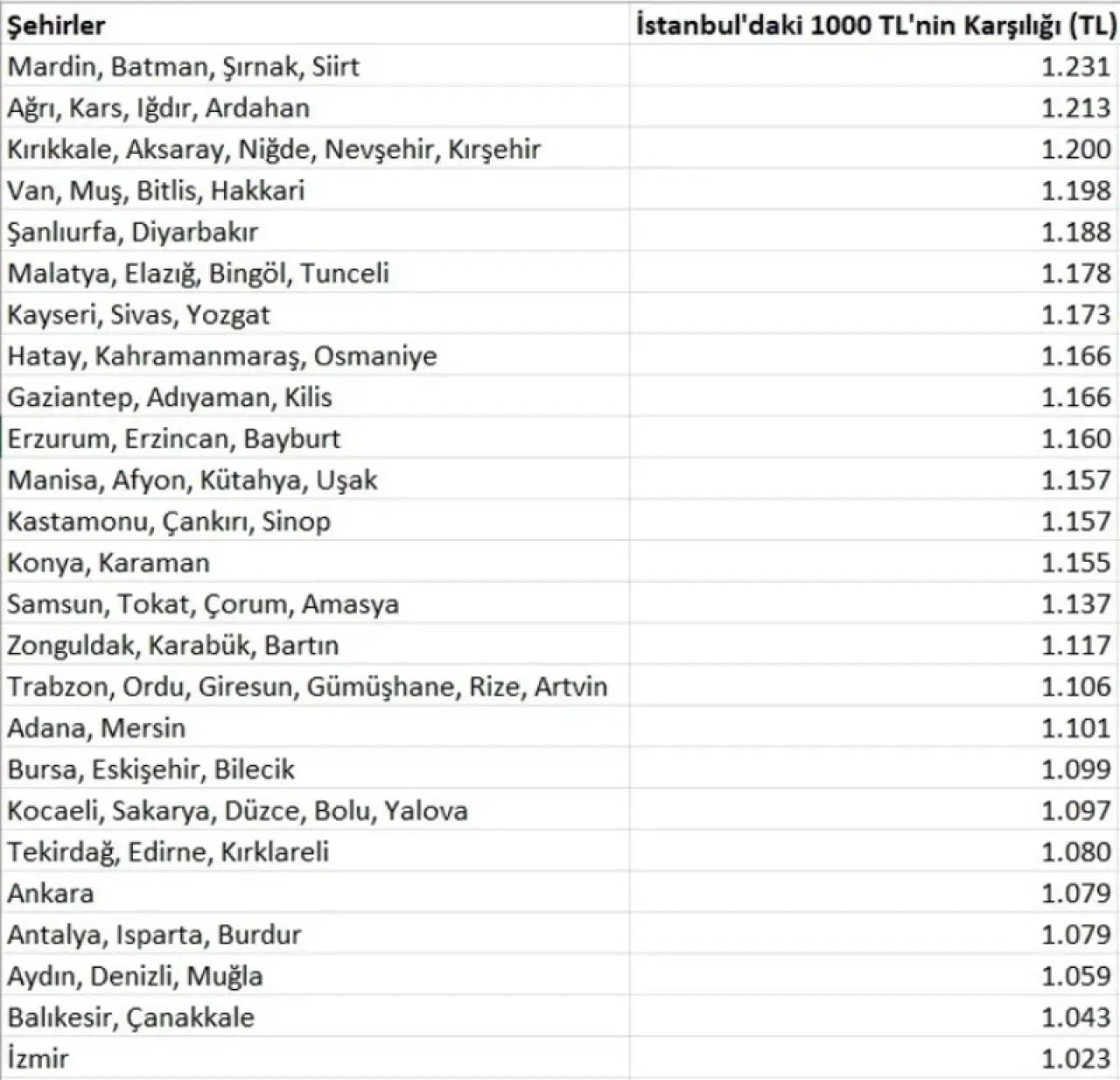 Araştırmaya göre İstanbul’da 1.000 TL’nin satın alma gücü; Mardin, Batman, Şırnak ve Siirt gibi illerde yaklaşık 1.231 TL’ye karşılık geliyor. Bu tablo, alım gücünün batıdan doğuya gidildikçe arttığını net biçimde ortaya koyuyor.