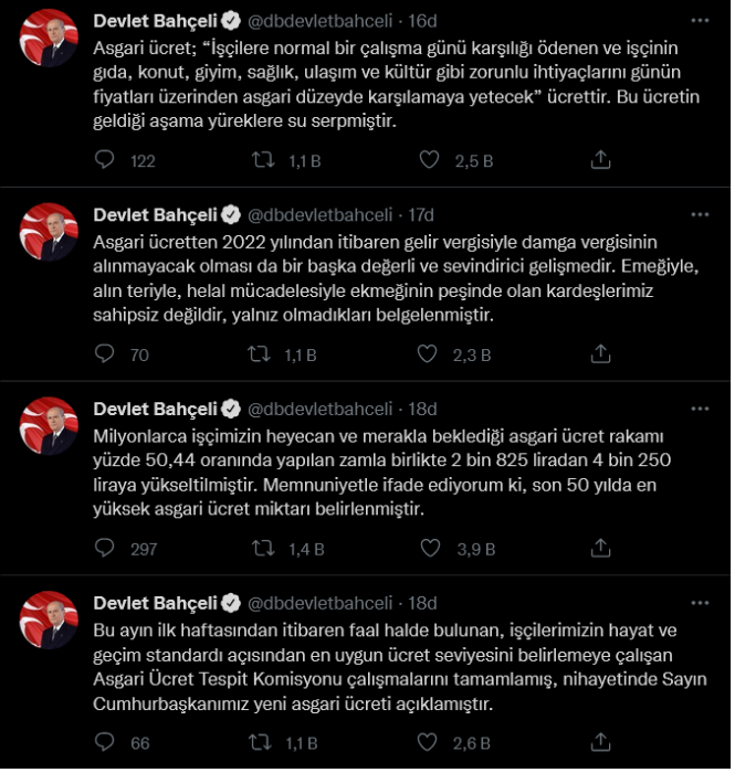 MHP Genel Başkanı Devlet Bahçeli, Twitter hesabından asgari ücret ile ilgili açıklamalarda bulundu. Devlet Bahçeli, "Asgari Ücret Yönetmeliği"nde bulunan asgari ücret tanımını paylaşarak açıklanan asgari ücretin son 50 yılın en yüksek miktar olduğunu söyledi. Öte yandan dolar bazında geçen sene olan 380 dolar olan asgari ücret "zam"dan sonra 280 dolar oldu.