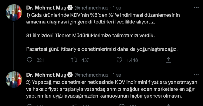 Ticaret Bakanı Mehmet Muş, Twitter hesabından temel gıda ürünlerine gelen KDV indirimine ilişkin denetimlerin yapılacağını açıkladı.