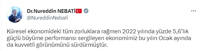 Küresel ekonomideki tüm zorluklara rağmen 2022 yılında yüzde 5,6’lık güçlü büyüme performansı sergileyen ekonomimiz bu yılın Ocak ayında da kuvvetli görünümünü sürdürmüştür.