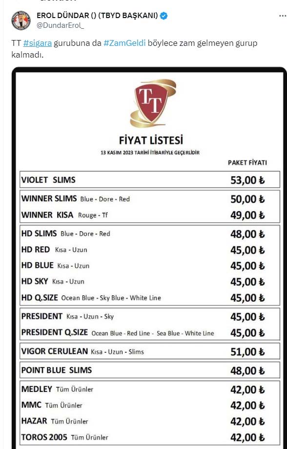 JTİ, BAT, Philip Morris, Imperial Tobacco’nun ardından bir sigara grubuna daha zam geldi. Tekel Bayileri Yardımlaşma Derneği Başkanı Erol Dündar, sosyal medya hesabından bir sigara grubuna daha zam geldiğini ve böylece zam yapmayan grup kalmadığını açıkladı. Dündar’ın yayınladığı listeye göre; TT grubunun en pahalı sigarası 53 liraya yükselirken, en ucuz sigarası 42 lira oldu.