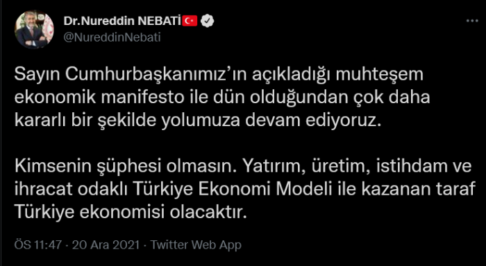 Cumhurbaşkanı Recep Tayyip Erdoğan'ın bugün açıkladığı Türk Lirası mevduatlarındaki düzenlemeden sonra döviz kurlarında sert düşüş yaşandı. Hazine ve Maliye Bakanı Nureddin Nebati, Twitter'dan kurlardaki sert düşüşten sonra ilk paylaşımını yaptı. Bakan Nebati'nin paylaşımı şöyle: