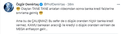 Demirtaş sosyal medya hesabından ”Olayları tane tane anlatan videomdan sonra banka kredi faizlerine sınırlama gelmiş. Ama bu da Çalışmaz! Bu sefer de o düşük orandan hiçbir banka kredi vermez. KAMU bankaları aracılığı ile krediyi o düşük orandan verirsen de Mega enflasyon gelir…” ifadelerini kullandı.