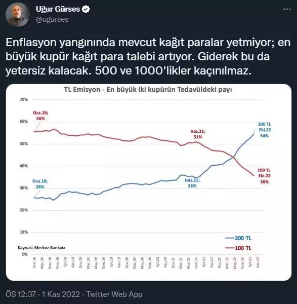 Ekonomist Uğur Gürses de konuyla ilgili sosyal medya hesabından, "Enflasyon yangınında mevcut kağıt paralar yetmiyor; en büyük kupür kağıt para talebi artıyor. Giderek bu da yetersiz kalacak. 500 ve 1000'likler kaçınılmaz" diyerek bir paylaşımda bulundu.