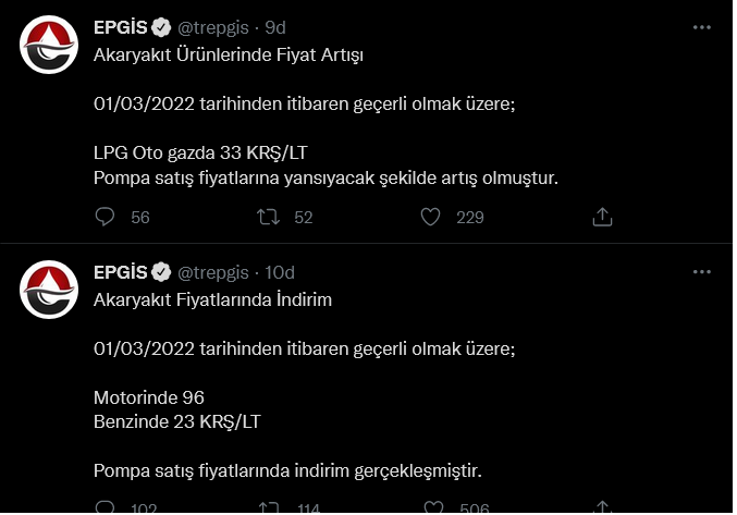 EPGİS, sosyal medya hesabından Benzin ve motorine indirim yapıldığını açıklarken LPG Oto gaza zam geldiğini belirtti.