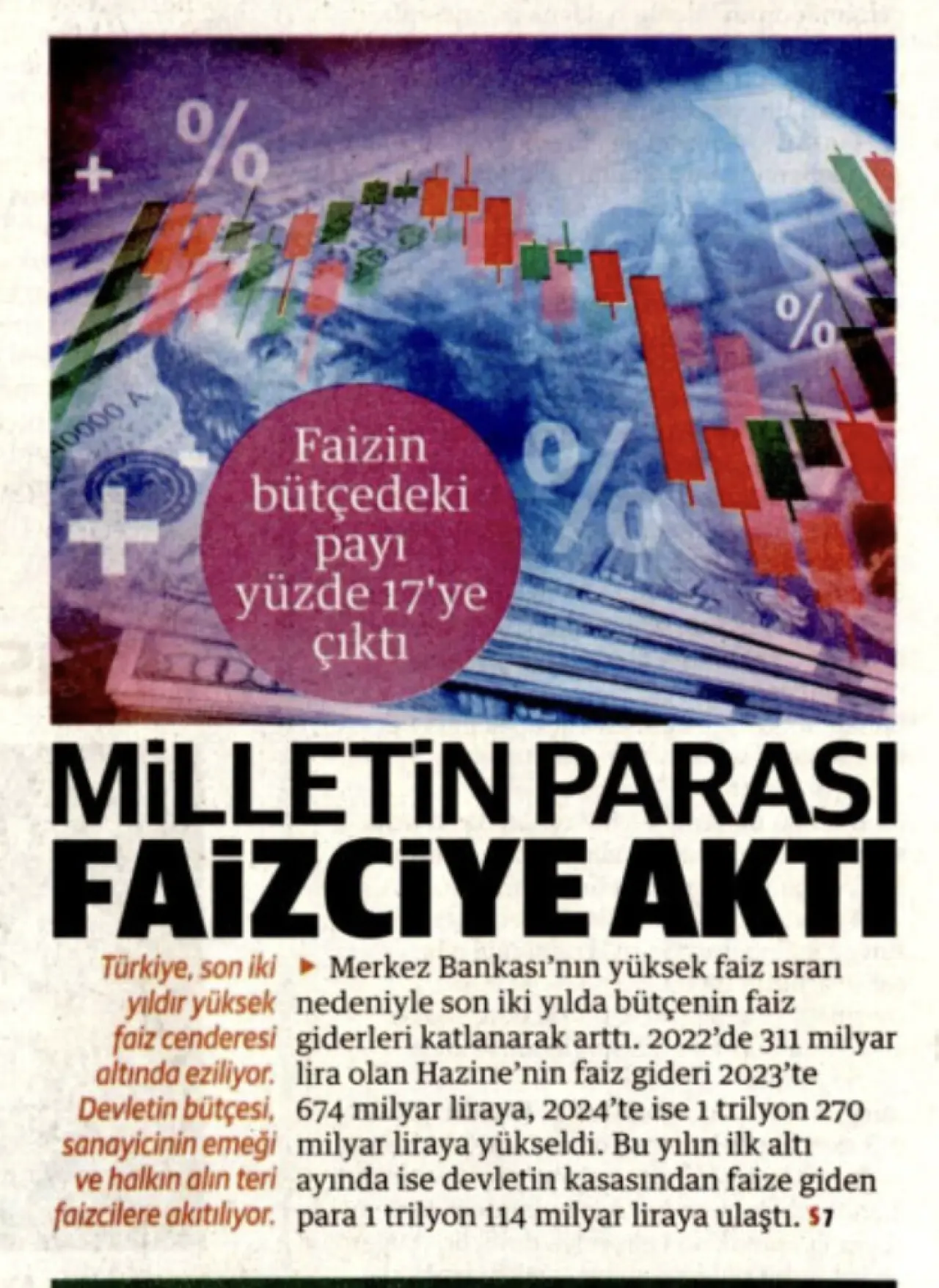"Milletin parası faizciye aktı" denilen haberde, "Türkiye, son iki yıldır dünyanın hiçbir ülkesinde görülmeyen bir yüksek faiz cenderesi altında eziliyor. Devletin bütçesi, sanayicinin emeği ve halkın alın teri faizcilere akıtılıyor. Son 2 yılda Son iki yılda vatandaşın cebinden, şirketlerin ve Hazine’nin kasasından 600 milyar dolar rantiyeye gitti. Yüksek faiz nedeniyle devlet, sadece borç faizi için bu yılın ilk altı ayında 1 trilyon 114 milyar lira ödeme yaptı. Sanayi ise artık üretimden değil, kredi yükünden dolayı zarar ediyor. Türkiye bu tablonun eşiğinde bugün bir karar verecek. Merkez Bankası ya ciddi bir faiz indirimi yaparak üretime destek verecek ya da paradan para kazanan faiz lobilerini sevindirmeye devam edecek" denildi.