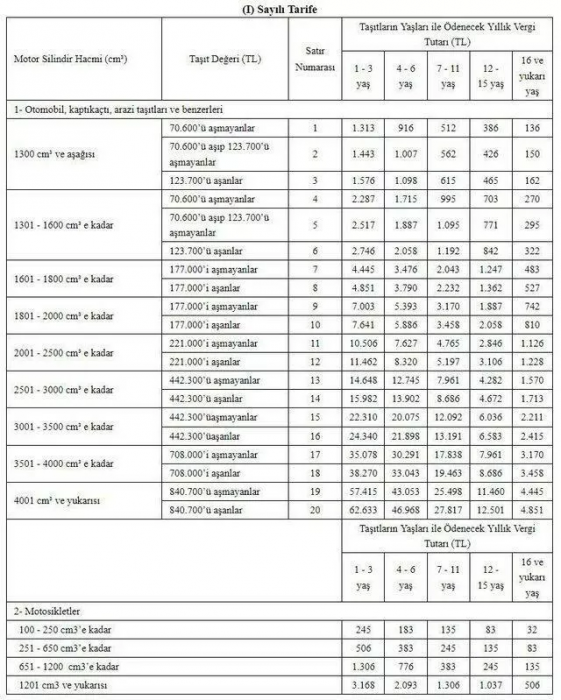 Resmi Gazete'de yüzde 25 olarak belirlenen yeniden değerlendirme oranı ile 1300 motor araca 1051 TL vergi ödeyenler bu yıl değeri 70 bin 600 Türk Lira'sını aşmayan bir yaşındaki 1300 motor araç için 1313 Türk Lirası vergi ödeyecek.