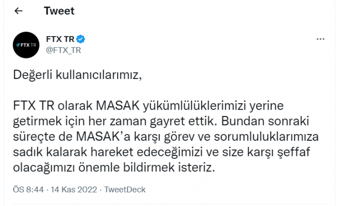 FTX Türkiye: "MASAK’a karşı görev ve sorumluluklarımıza sadık kalarak hareket edeceğiz"