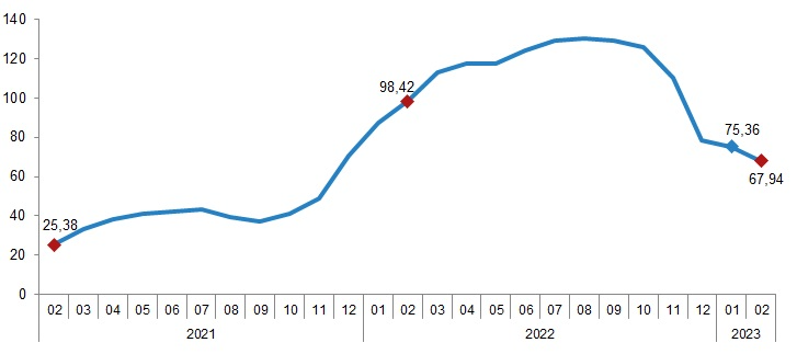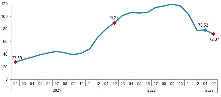 Türkiye İstatistik Kurumu (TÜİK), şubat ayı inşaat maliyet endeksi verilerini yayımladı. Verilere göre, inşaat maliyet endeksi, şubatta bir önceki aya göre yüzde 2,08, bir önceki yılın aynı ayına göre yüzde 72,37 arttı. Bir önceki aya göre malzeme endeksi yüzde 3,43 arttı, işçilik endeksi yüzde 1,20 azaldı. Ayrıca bir önceki yılın aynı ayına göre malzeme endeksi yüzde 62,52, işçilik endeksi yüzde 103,99 arttı.