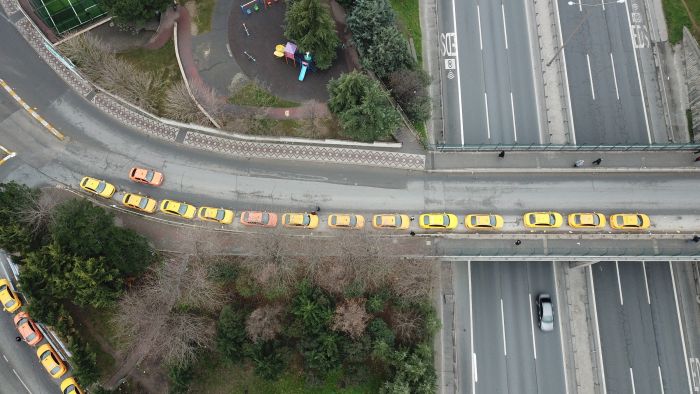 İstanbul'da taksi şoförleri yeni tarifeye uygun olarak taksimetrelerini güncellemek için bugün de sıraya girdi. Ataşehir'de yaşanan taksi kuyruğu havadan da görüntülendi.