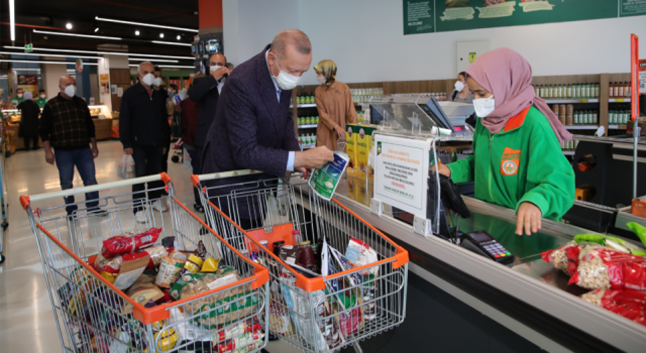 Eşi Emine Erdoğan, kızı Sümeyye Erdoğan Bayraktar ve torunu Canan Aybüke ile Tarım Kredi Kooperatifi satış mağazasından alışveriş yapan Erdoğan, iki yıl önceki alışverişinde sadece bisküvi, gofret gibi atıştırmalıklar alırken, bu kez iki alışveriş arabasını doldurdu. Kurutulmuş meyveler, mantı, gevrek, kuruyemiş, şalgam ve meyve suları, çikolata, bisküvi, kurabiye, gofret ve cips alan Erdoğan'ın alışverişinin toplam tutarı da ortaya çıktı.