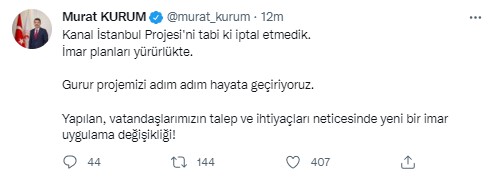 Sosyal medya hesabından açıklama yapan Kurum ”Kanal İstanbul Projesi’ni tabi ki iptal etmedik. İmar planları yürürlükte. Gurur projemizi adım adım hayata geçiriyoruz. Yapılan, vatandaşlarımızın talep ve ihtiyaçları neticesinde yeni bir imar uygulama değişikliği!” dedi.