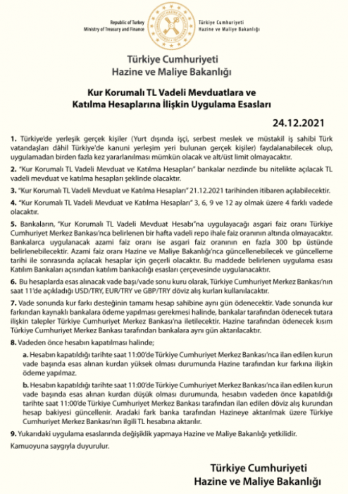 Hazine ve Maliye Bakanlığı kur korumalı TL vadeli mevduatlara ve katılma hesaplarına ilişkin uygulama esasları hakkında bir açıklama daha yayımladı.