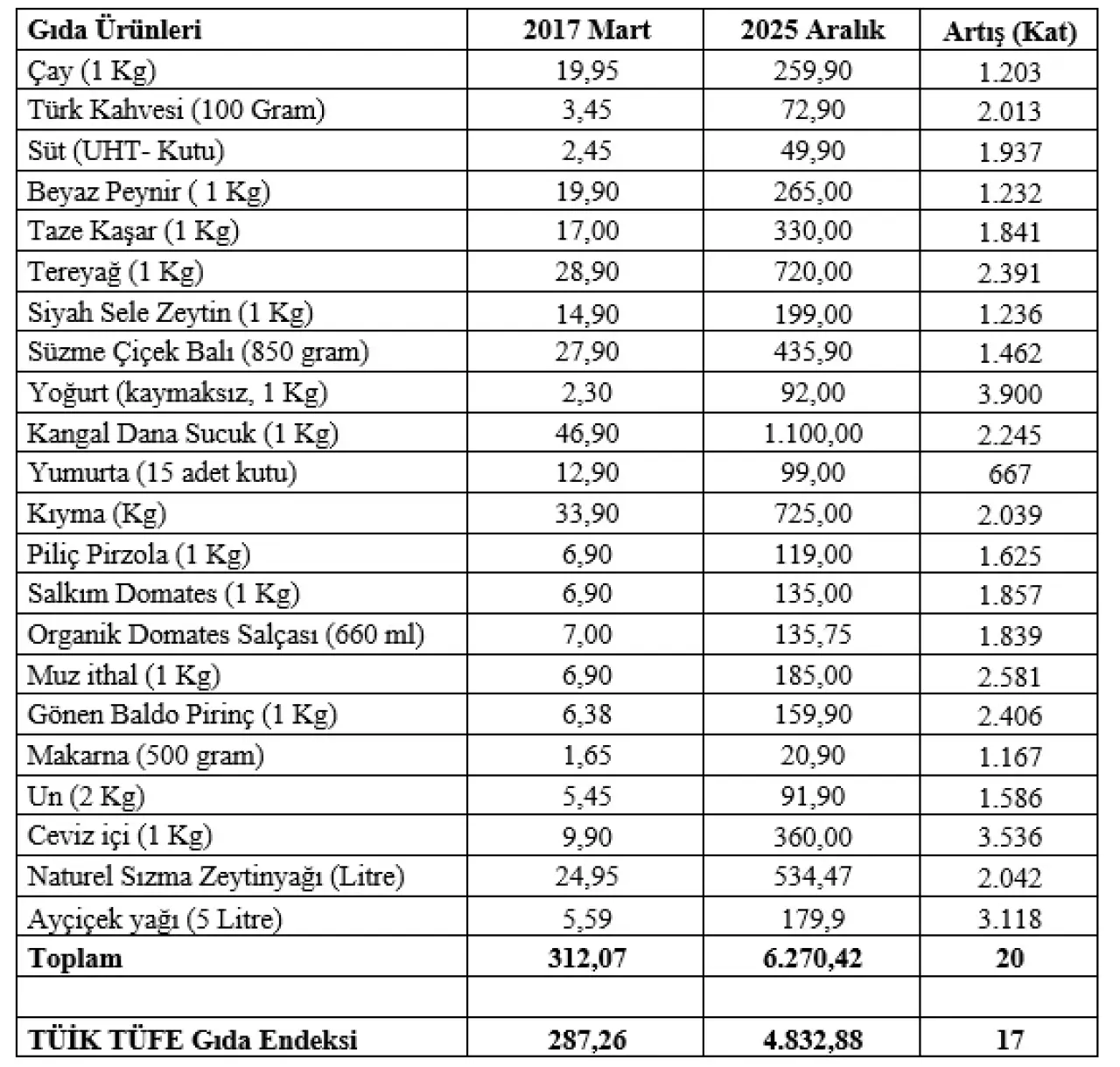 Yapılan karşılaştırmaya göre, 2017 yılında broşürde yer alan gıda ürünlerinin toplam fiyatı ile 2025 yılı fiyatları arasında yaklaşık 20 katlık bir artış yaşandı. Eğilmez, bu artışın Türkiye İstatistik Kurumu’nun (TÜİK) TÜFE Gıda ve Alkolsüz İçecekler alt grubu endeksindeki yaklaşık 17 katlık artışın da üzerinde olduğuna dikkat çekti.
