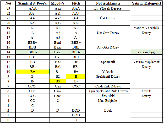 Buna göre; S&P’nin B+ notu ‘Yüksek Spekülatif Düzey’ anlamına gelirken, yatırım kategorisi olarak ise ’Düşük Düzey’de yer aldı. S&P’nin notu Yatırım Eşiği’nin hemen altında yer aldı.