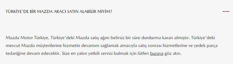 Mazda Türkiye'nin web sayfasında yer alan bilgiye göre, satış sonrası hizmetler ve yedek parça tedariği ise devam edecek.