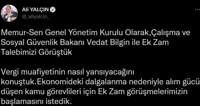 Memur-Sen Genel Başkanı Ali Yalçın, sendika olarak ,Çalışma ve Sosyal Güvenlik Bakanı Vedat Bilgin ile ek taleplerini görüştüklerini Twitter'dan açıkladı. Yalçın, ayrıca Bakan Bilgin ile vergi muafiyeti düzenlemesinin memur maaşlarına nasıl yansıyacağını da konuştuklarını dile getirdi. Ali Yalçın'ın paylaşımı şöyle: