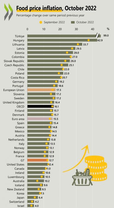OECD ülkeleri arasında, yüzde 99 ile Türkiye ve yüzde 42.9 ile Macaristan'ın ardından gıda enflasyonun en yüksek olduğu ülkeler, fiyatların geçen yılın aynı dönemine göre yüzde 33.7 artan Litvanya ve yüzde 29.5 artan Letonya oldu.