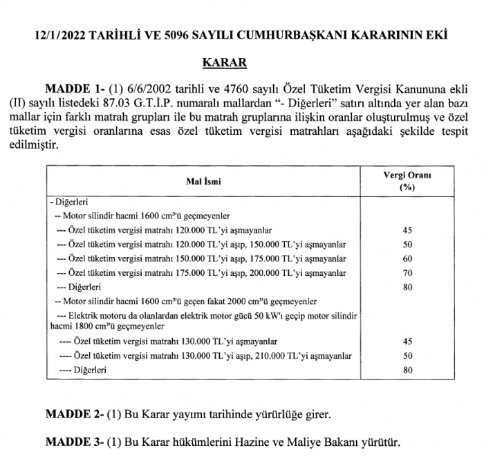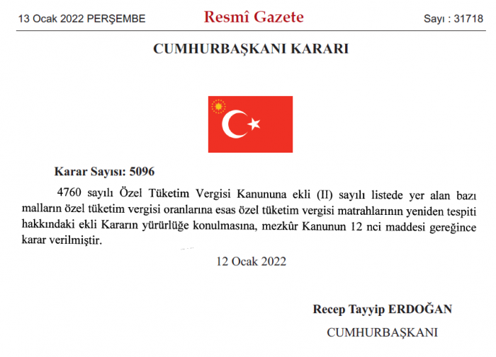 Otomobiller için Özel Tüketim Vergisi (ÖTV) matrahı güncellemesi yapıldı. Matrah güncellemesinin yanı sıra yeni ÖTV oranları da belirlendi. Karar, Cumhurbaşkanı Recep Tayyip Erdoğan'ın imzasıyla 13 Ocak 2022 tarihli Resmi Gazete'de yayımlandı. Karar şöyle: