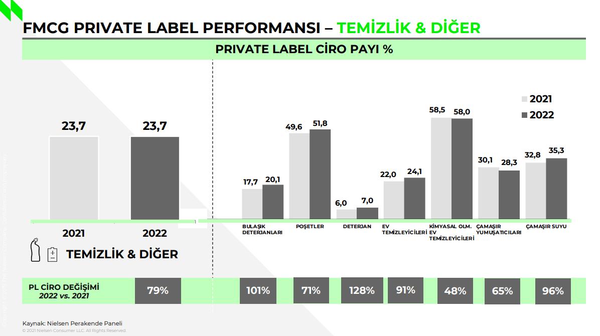 PLAT Özel Markalı Ürünler Sanayicileri ve Tedarikçileri Derneği ve NielsenIQ Perakende Paneli tarafından yapılan araştırmaya göre 2022’nin tamamında özel markalı ürünlerin cirosu bir önceki yıla göre yüzde 99 artarken pazar payı ise 1,5 puan yükseldi. Ana kategoriler arasında en fazla artış yüzde 29’luk pazar payı ve yüzde 102’lik ciro değişimiyle kişisel bakım ürünlerinde görüldü. Nielsen’in raporundan elde edilen veriler şu şekilde: “Sigara ve alkol ürünleri hariç hızlı tüketim ürünlerindeki pazar payı 2021 yılında 27,7 iken bu oran 2022 yılında 1,5 puanlık artışla 28,1’e yükseldi.