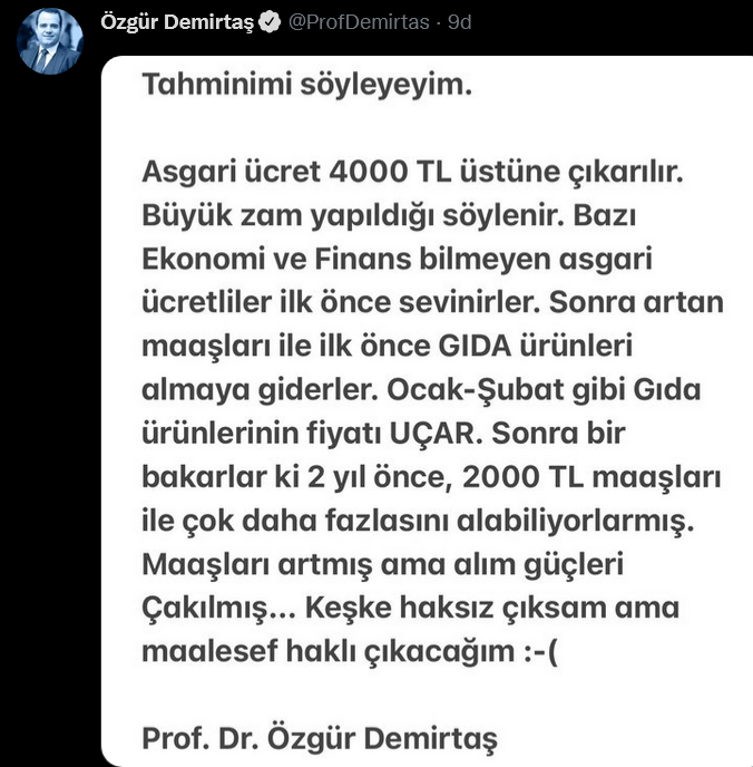 Ünlü ekonomist Özgür Demirtaş, sosyal medya hesabından asgari ücretin 4 bin lira üzerine çıkması üzerine açıklamalarda bulundu.