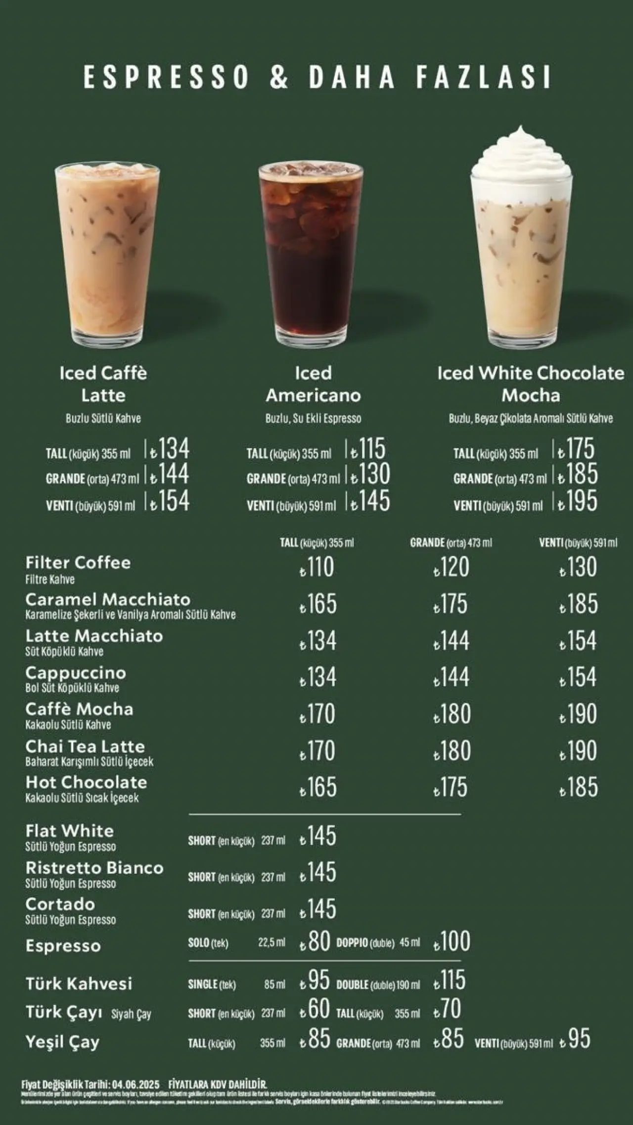 Yeni gelen zam ile birlikte, Starbucks’taki küçük boy filtre kahve 110 TL’ye yükseldi. Orta boy (Grande) filtre kahve 120 TL, büyük boy (Venti) filtre kahve ise 130 TL olarak belirlendi.