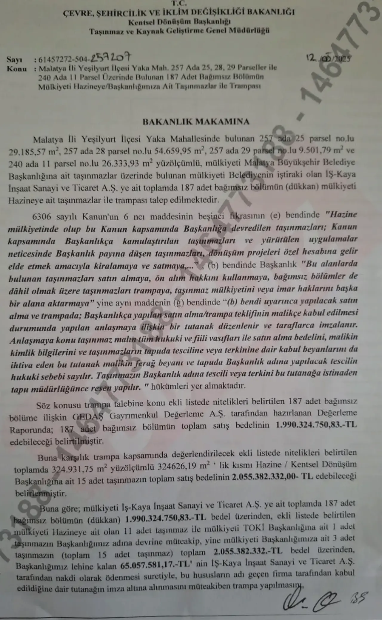 Depremin ağır yıkıma uğrattığı Malatya Yeşilyurt'ta 183 dükkan inşa eden Diyarbakır merkezli İŞ KAYA İnşaat, bu dükkanları TOKİ’nin iştiraki GEDAŞ tarafından yapılan değerleme ile 1 milyar 990 milyon TL bedelle devlete sundu. Karşılığında ise aralarında İzmir Çeşme'de 4 adet ve Bornova’da 1 adet olmak üzere toplam 5 parsel içeren, ülke genelinde 15 taşınmazın takası gündeme geldi.