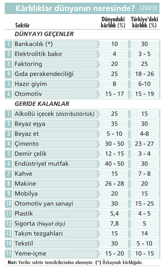Nedenler farklı olsa da birçok sektörde tablo benzer. Mobilya, makine, otomotiv yan sanayi, tekstil, plastik ve çimentoda kâr marjları, gelişmiş pazarlardaki rakiplerin altında seyrediyor. Üstelik pek çok sektörde kâr marjlarının bu yıl biraz daha düşmesi bekleniyor.