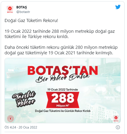 Paylaşımda, "19 Ocak 2022 tarihinde günlük 288 milyon metreküp doğalgaz tüketimi ile Türkiye rekorunun yanı sıra 81 ilimizin 73'ünde de günlük doğal gaz tüketim rekoru kırıldı" ifadeleri kullanıldı.