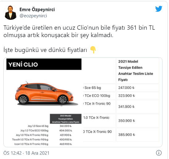 Özpeynirci tweetinde, "Türkiye’de üretilen en ucuz Clio’nun bile fiyatı 361 bin TL olmuşsa artık konuşacak bir şey kalmadı" ifadelerini kullandı.