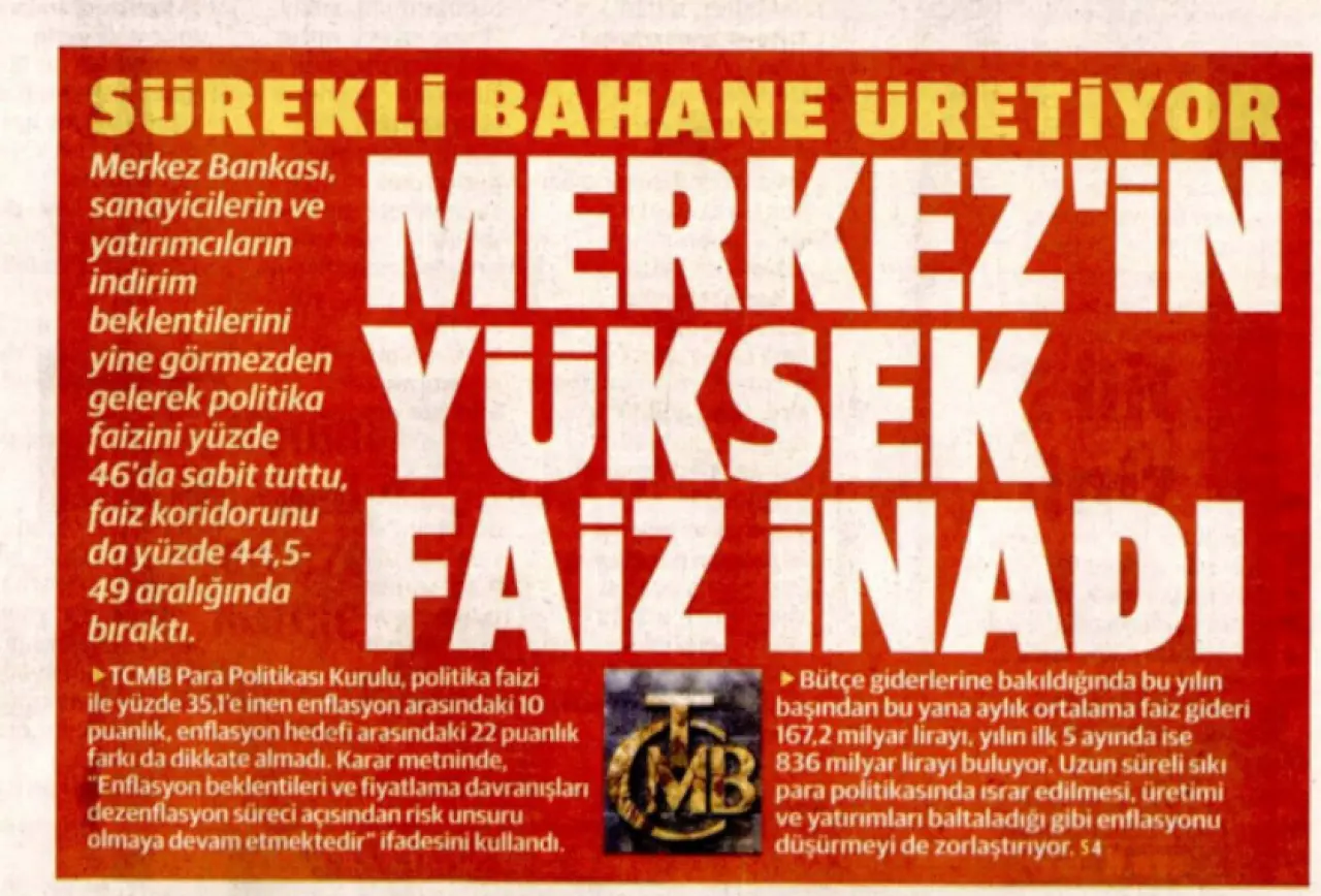 Yeni Şafak'ın "Sürekli bahane üretiyor: Merkez Bankası'nın yüksek faiz inadı" başlıklı haberinde, "Merkez Bankası, sanayicilerin ve indirim beklentilerini yine görmezden gelerek politika faizini yüzde 46'da sabit tuttu, faiz koridorunu da yüzde 44,5-49 aralığında bıraktı" denildi.