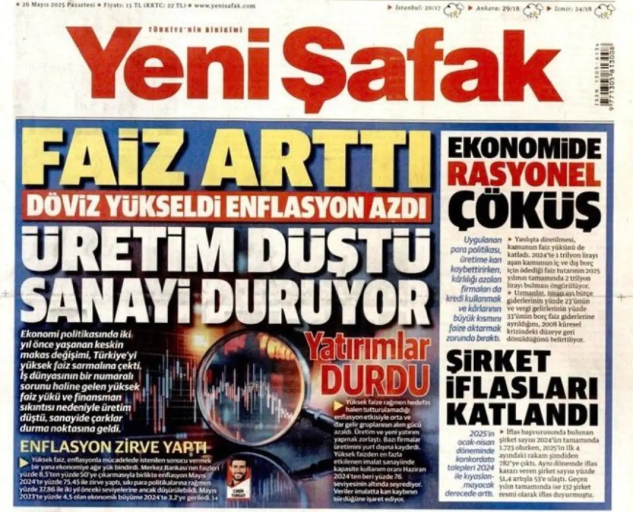 Yeni Şafak yaptığı haberde "Ekonomi politikasında iki yıl önce yaşanan keskin makas değişimi, Türkiye'yi yüksek faiz sarmalına çekti. İş dünyasının bir numaralı sorunu haline gelen yüksek faiz yükü ve finansman sıkıntısı nedeniyle üretim düştü, sanayide çarklar durma noktasına geldi." ifadelerini kullandı.
