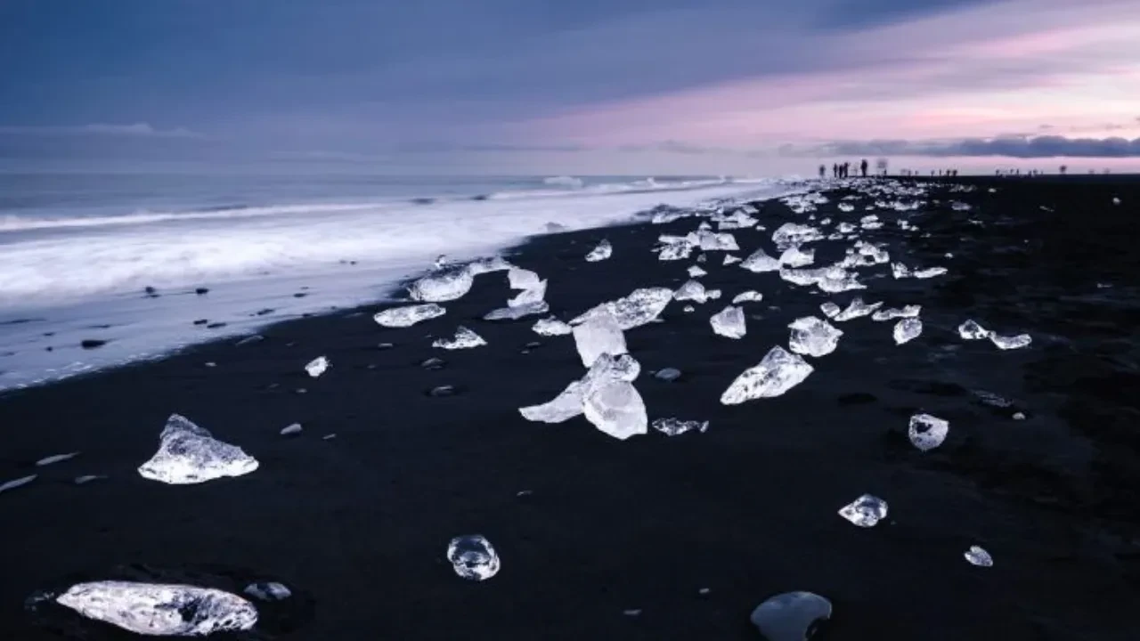 Bu dünyadan uzak siyah volkanik kumlu plaj, buzul lagününden gelen kristal berraklığındaki buz dağlarının kıyı şeridi boyunca mücevher gibi dağıldığı bir sahneye dönüşüyor.
