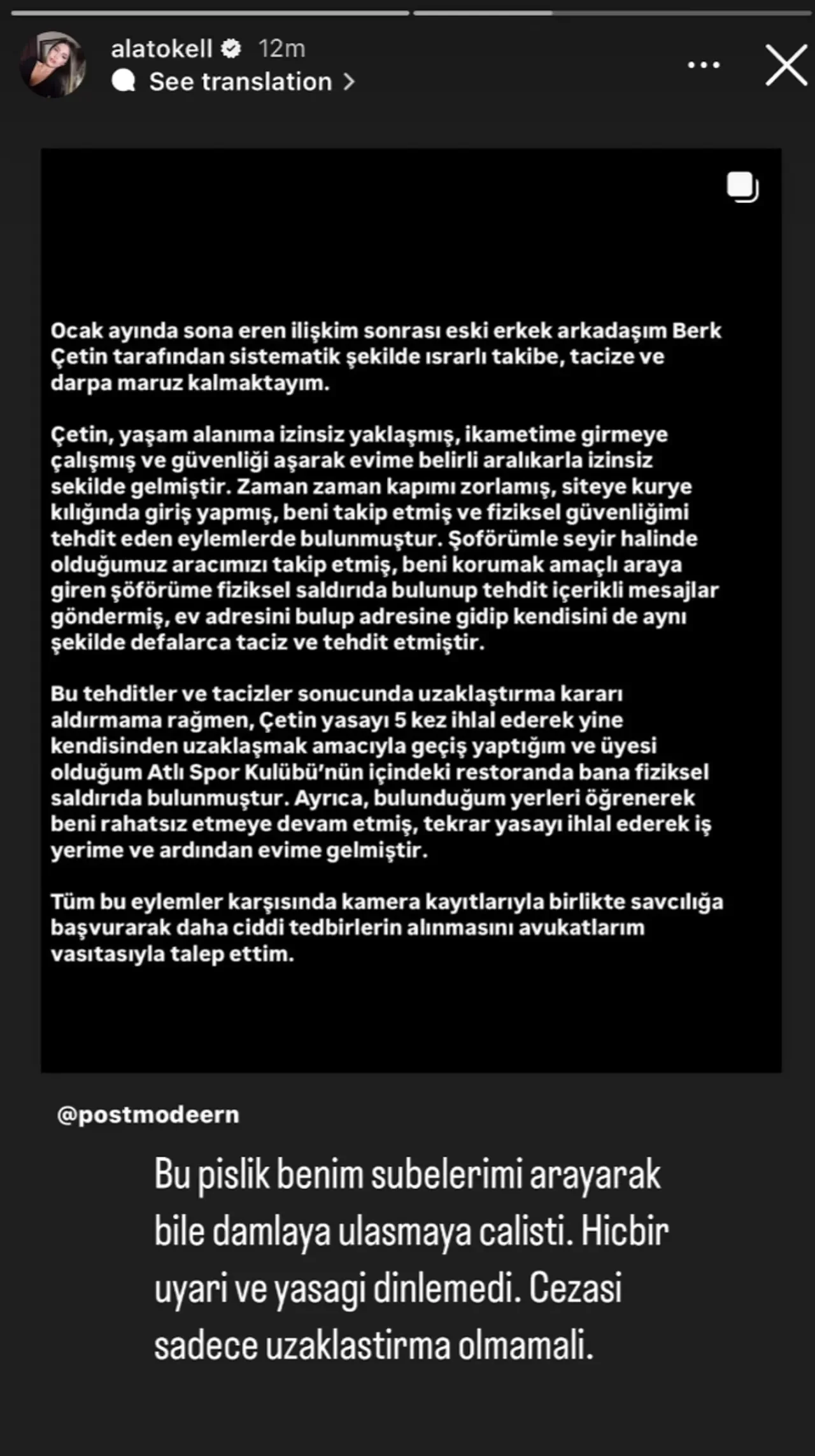 Ala Tokel, sosyal medya hesabından yaptığı paylaşımda, “Bu pislik benim şubelerimi arayarak bile Damla’ya ulaşmaya çalıştı. Hiçbir uyarı ve yasağı dinlemedi. Cezası sadece uzaklaştırma olmamalı,” sözleriyle Çetin’e tepki gösterdi.