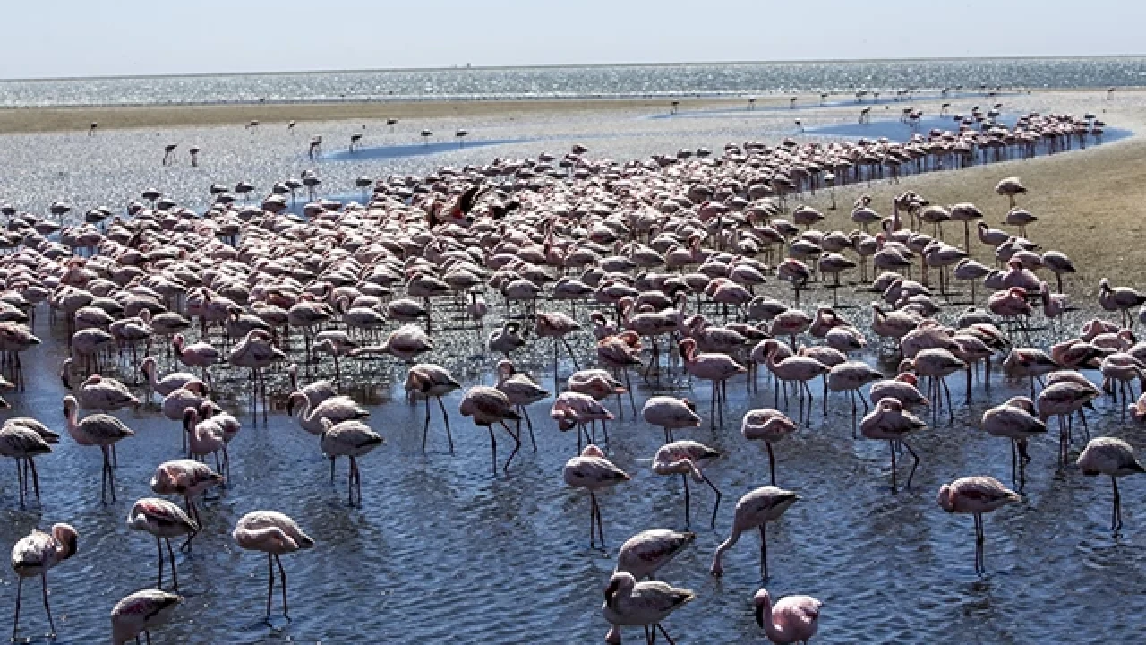 Namibya'nın ana liman şehri Walvis Bay'in güneyindeki büyük lagün, zengin bir flamingo nüfusuna ev sahipliği yapıyor. Namib Çölü'nün Atlas Okyanusu'na açıldığı uçsuz bucaksız sahilde yer alan Walvis Bay Lagünü, Güney Afrika bölgesinin en önemli kıyı set göllerinden biri olma özelliği taşıyor. AA muhabirinin Walvis Bay Turizm Ofisinden edindiği bilgiye göre, her yıl başta büyük ve küçük flamingolar olmak üzere 150'den fazla türden on binlerce göçmen kuş, yaz aylarını lagün ve çevresindeki tuzlada geçiriyor.