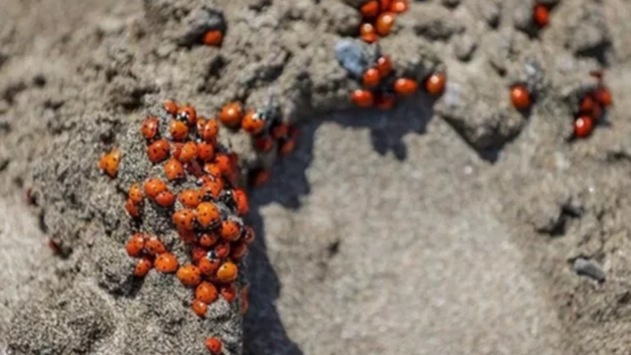 Plajda onlarca uğur böceğinin oluşturduğu kırmızı öbekleri görenler fotoğraf çekerek bu anları kayıt altına alıyor.
