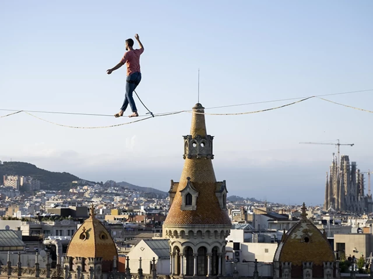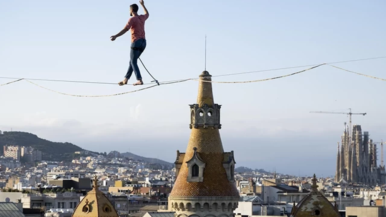 Fransız ip cambazı ve sanatçı Nathan Paulin, GREC festivali kapsamında İspanya'nın Barselona şehrindeki Plaza de Catalunya meydanının üzerinde ip üzerinde yürüdü.