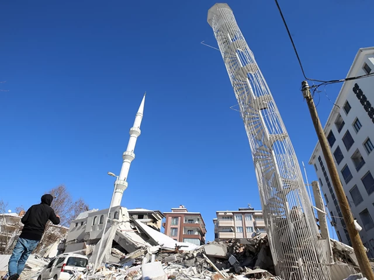"Asrın felaketi" olarak nitelendirilen Kahramanmaraş merkezli depremlerde çok sayıda binanın yıkıldığı Malatya'nın Zaviye Mahallesi'ndeki 5 katlı binanın yalnızca yangın merdiveni ayakta kaldı. Bir kedinin de bölgede bulunan araca sığındığı görüldü.